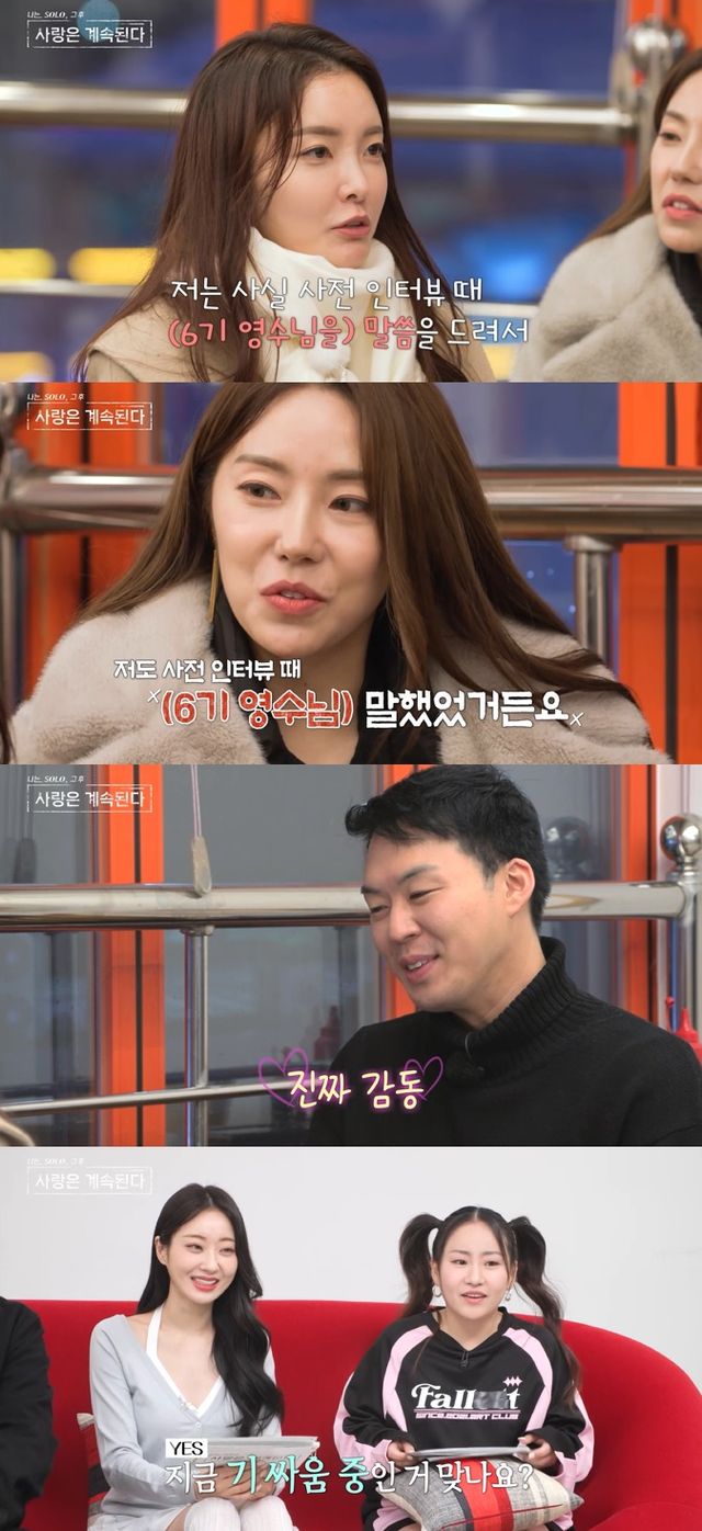 그러나 이것도 잠시, 꽃바구니 선택으로 6기 영수와 통했던 17기 영숙은 "사전 인터뷰 때 (6기 영수님을 보고 싶다고) 말씀 드려가지고..."라며 어필하고, 15기 현숙은 이에 질세라 "저도 사전 인터뷰 때 말했었다"고 맞받아친다.