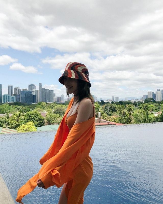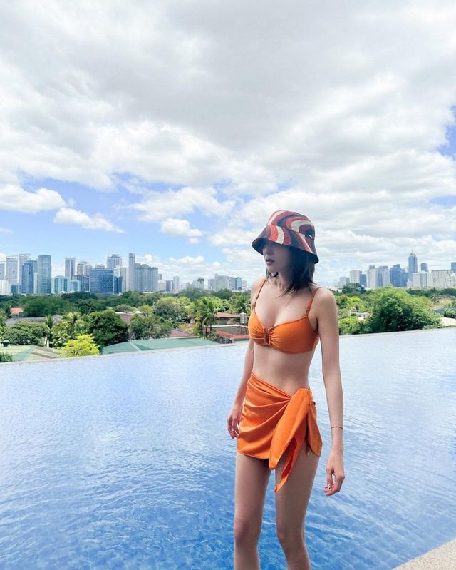 공개된 사진 속 산다라박은 필리핀 수영장에서 포즈를 취하고 있다. 오렌지색 비키니를 입은 산다라박은 볼륨감 넘치는 반전 글래머 몸매로 시선을 사로잡았다.