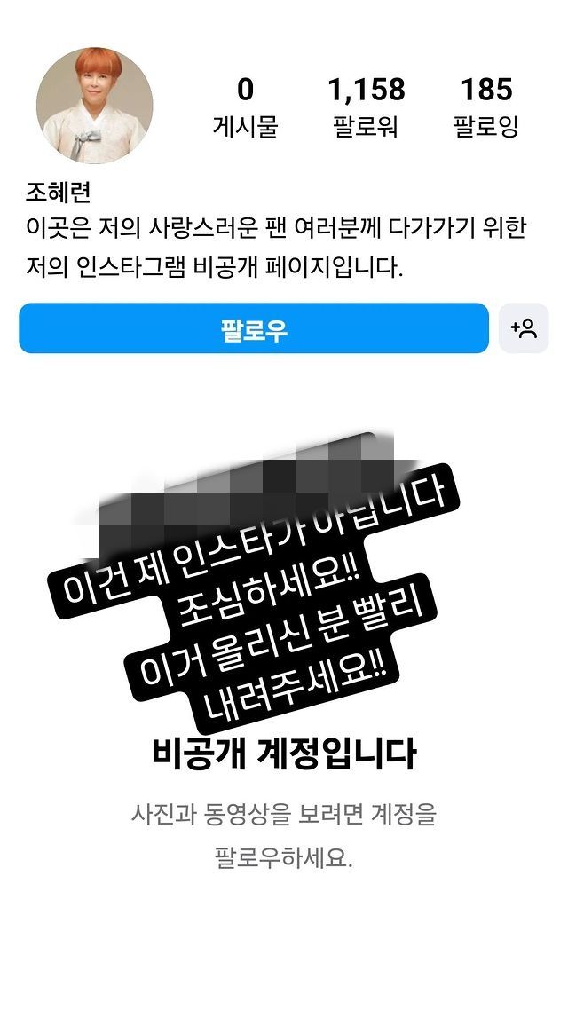 이에 조혜련은 "이건 제 SNS가 아닙니다. 조심하세요. 이거 올리신 분 빨리 내려주세요"라는 글을 덧붙였다.