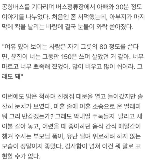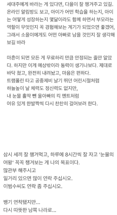 이어 “세대주(이범수)에게 바라는 게 있다면 아들 잘 챙겨주고 있길”이라며 “온라인 알림방도 보고, 아이가 어떤 학습을 하는지, 아이는 어떻게 성장하는지 몇 달이라도 함께하면서 부모라는 역할이 무엇인지 꼭 경험해보는 계기가 되었으면 좋겠다. 그래서 딸에게도 어떤 아빠로 남을 것인지 잘 생각해보길 바란다”고 덧붙였다.