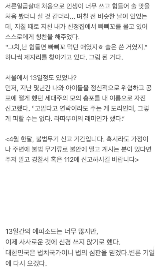 이어 “4월 한 달은 불법무기 신고기간”이라며 “혹시라도 가정이나 주변에 불법 무기류로 불안에 떨고 계시는 분이 있다면 주저 말고 경찰서 혹은 112에 신고하길 바란다”고 덧붙였다.
