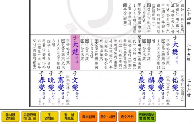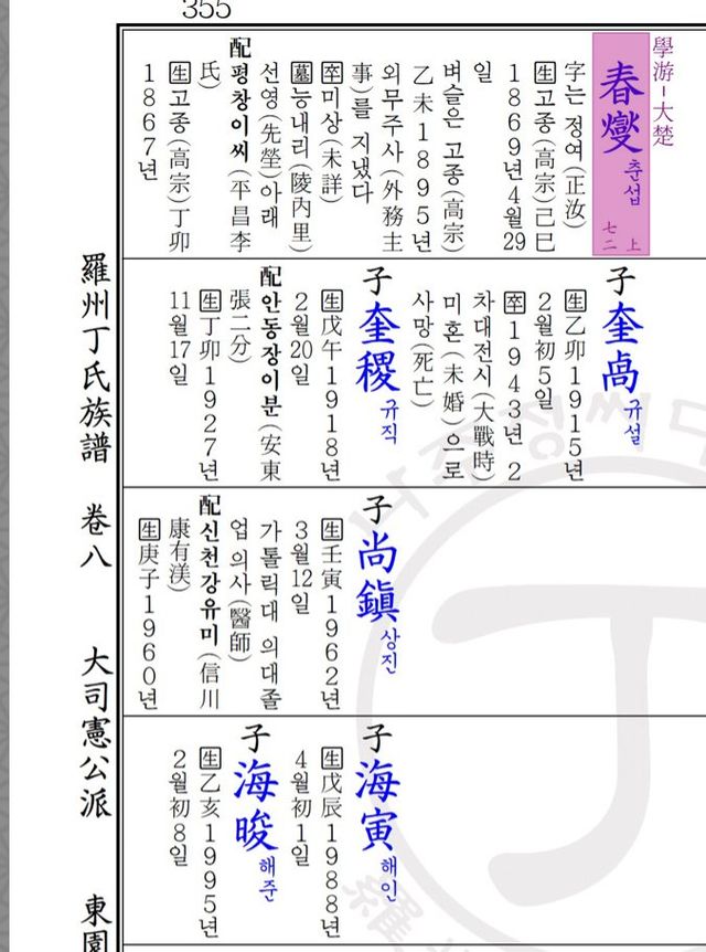 이들 중 막내인 대초(25세손)에게는 보는것과 같이 4명의 아들들이(26세손) 있는데. 마지막으로 4남 중 막내인 춘섭(26세손)의 족보를 다시 살펴보면.