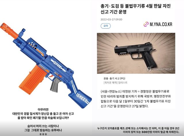 이윤진은 이어 '총검 도검 등 불법무기류 4월 한달 자진신고 기간 운영'이라는 제목의 기사와 함께 "누구든지 모의총포를 제조 판매 또는 소지해서는 안 되며, 이를 어길 경우 2년 이하의 징역 또는 500만원 이하의 벌금에 처해진다"는 글을 덧붙였다.