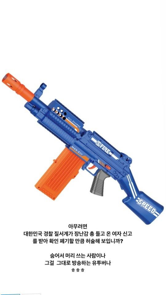 그는 "누구든지 모의총포를 제조, 판매 또는 소지해서는 안되며, 이를 어길 경우 2년 이하의 징역 또한 500만 원 이하의 벌금에 처해진다"라고 덧붙였다.