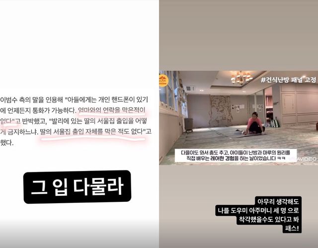 또한 소을 양의 서울집 출입을 막은 적이 없다는 내용에 대해 "그 입 다물라"라고 분노를 표출했다. 이후 자신의 SNS 메시지 등을 공개하며 소을 양이 한국집에 가려고 했으나 연락이 안 됐던 부분과, 다을 군이 메시지에 답하지 않았던 상황들을 캡처해 게재했다.