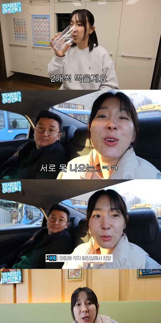 이후 이지혜는 녹화를 마치고 대장내시경을 위한 알약을 먹었다. 그는 알약과 연이어 물을 마시며 "죽겠다"고 지쳐했다.