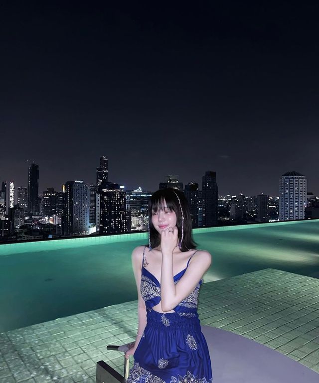 이유비는 방콕 야경이 내려다보이는 고층 건물의 루프탑 수영장에서 포즈를 취한 채 카메라를 응시하고 있다.