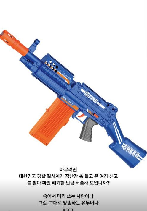 이윤진은 "아무려면 대한민국 경찰 질서계가 장난감 총 들고 온 여자 신고를 받아 확인 폐기할 만큼 허술해보입니까?"라며 유튜버의 주장을 반박했다. 이어 "숨어서 머리쓰는 사람이나 그걸 그대로 방송하는 유튜버나"라며 불쾌함을 드러냈다.