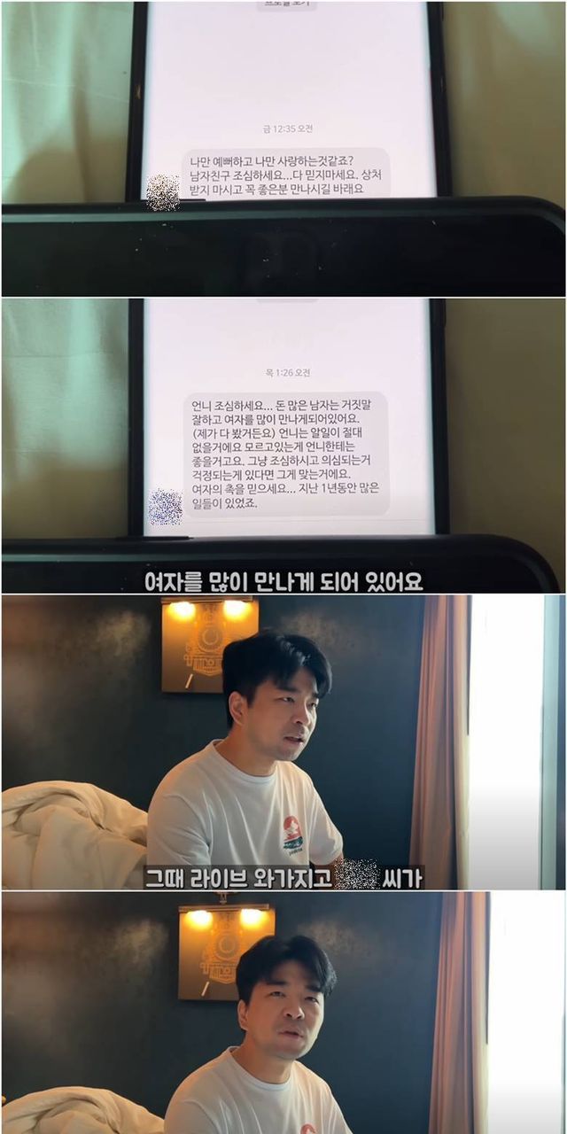 DM을 보면 "남친이 나만 예뻐하고 나만 사랑하는 것 같죠? 조심하세요. 다 믿지 마세요. 상처받지 마시고 꼭 좋은 분 만나시길 바라요", "언니 조심하세요. 돈 많은 남자는 거짓말 잘하고 여자를 많이 만나게 돼 있어요. 제가 다 봤거든요. 언니는 알 일이 절대 없을 거예요. 모르고 있는 게 언니한테는 좋을 거고요. 그냥 조심하시고 의심되는 거, 걱정되는 게 있다면 그게 맞는 거예요. 여자의 촉을 믿으세요" 등 두 사람의 사이를 이간질하는 내용이 담겼다.