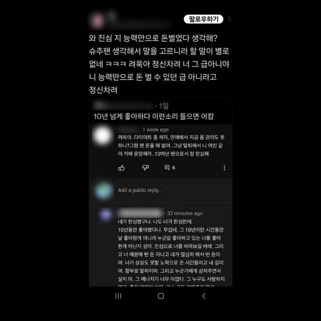 너 때문에 번 돈 아니고 지금 이 순간에도 제 욕하는 나쁜 사람들, 같이 화내주고 제 편 들어주고 응원해 주는 진짜 저의 팬들이 있어요.