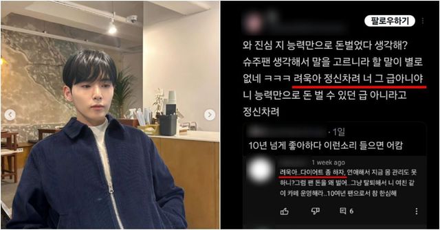 그뿐만 아니라, 려욱은 SNS에서 몸무게에 대한 지적을 하는 한 팬에게 직접 응답하며 "내가 열심히 해서 번 돈이고, 네가 상상도 못 할 노력으로 이루어낸 결과"라고 말하며 "함부로 말하지 마, 누군가에게 상처 주면서 살지 마. 그 에너지가 너무 아깝다"며 악플러를 향해 경고했다.