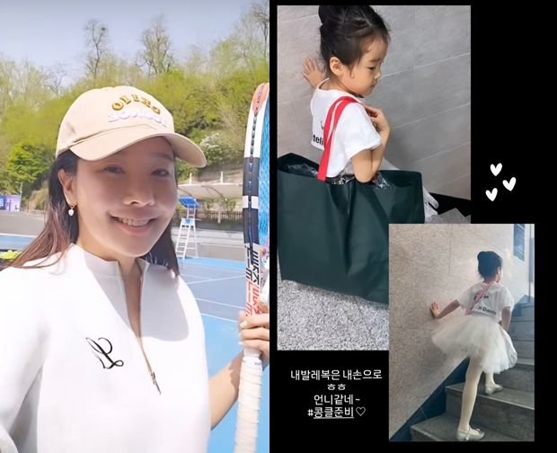 소유진은 "내 발레복은 내 손으로 ㅎㅎ 언니 같네 ~ #콩클준비"라며 발레복을 입고 있는 딸의 모습을 공개했다.