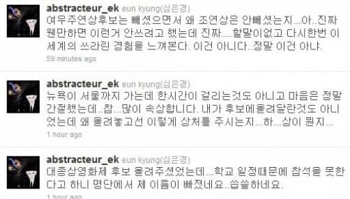 또한 심은경은 “여우주연상후보는 빼셨으면서 왜 조연상은 안 빼셨는지. 진짜 웬만하면 이런 거 안 쓰려고 했는데 진짜, 할 말이 없고 다시 한 번 이 세계의 쓰라린 경험을 느껴본다.”며 “이건 아니다. 정말 이건 아니야.”라고 거듭 강조하며 상처받은 심정을 토로했습니다.