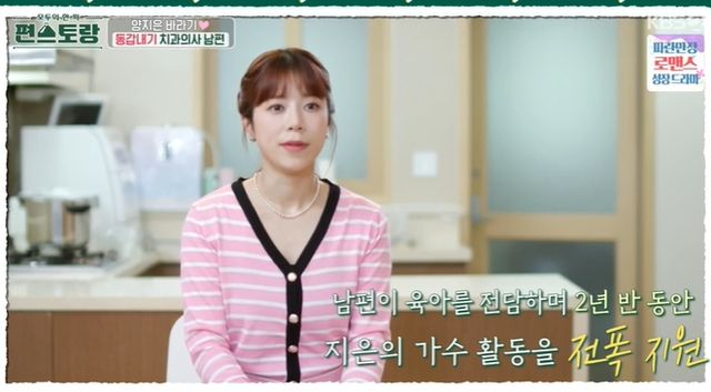 양지은은 "남편이 치과의사로 일했을 때는 내가 아이들을 맡아서 키웠고, 지금은 내가 일을 하고 있어서 남편이 2년 반 동안 육아를 하고 있다"고 말했다.