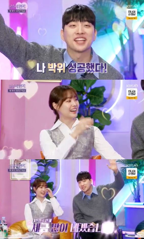 송지은의 남자친구인 박위는 자기소개를 이어가던 중 "송지은의 남자, 박위다"라고 인사해 눈길을 끈다. 그러면서 "나 박위, 성공했다. 세금 많이 내겠다"며 만세를 외쳤다. 이를 본 MC 이찬원은 너무 부럽다는 듯 "정말 10년간 수많은 방송을 해 봤는데 이런 방송은 처음이다"고 몸서리를 쳤다.
