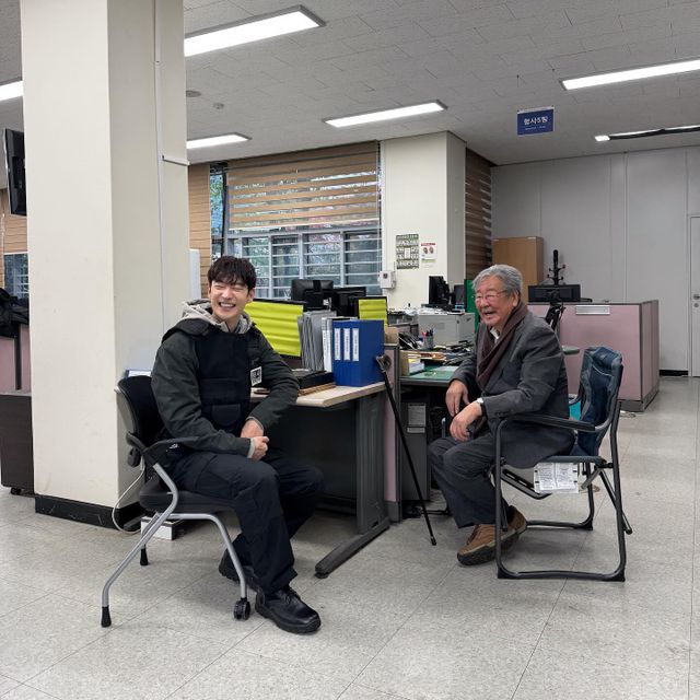 사진 속 이제훈은 MBC 새 금토드라마 '수사반장 1958' 1회에 노년 박영한으로 특별출연한 배우 최불암과 같은 공간에 앉아 환하게 웃고 있다.