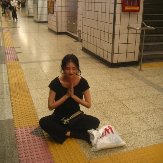 공개된 사진 속 한소희는 지하철 플랫폼에 앉아 가부좌를 틀고 손을 모은 채 명상하는 듯한 모습을 하고 있다.