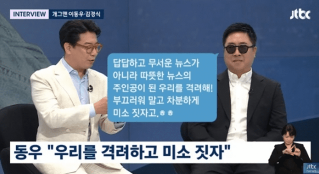 '장애인의 날'을 맞아 JTBC 뉴스룸에 출연한 김경식은 이날 아침 이동우가 '답답하고 무서운 뉴스가 아니라 따뜻한 뉴스의 주인공이 된 우리를 격려해! 부끄러워 말고 차분하게 미소 짓자고'라고 보낸 문자를 공개했습니다.