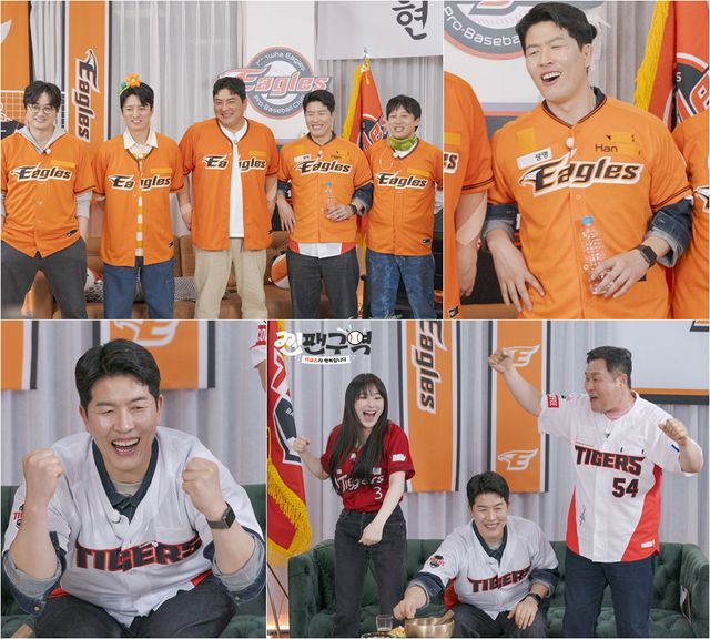 급기야 김병현은 타이거즈 유니폼 위에 이글스 유니폼을 덧입은 채 차태현, 김태균, 인교진, 이장원과 ‘최강한화’를 연호해 윤경호와 이채연이 김병현의 응원 갈아타기에 분노를 폭발시킨다고. 그러나 김병현은 태연한 모습으로 “내가 오렌지색이 잘 맞아~”라고 능글맞게 응수해 모두의 배꼽을 빠지게 한다. 김병현의 놀라운 변신력에 인교진은 “형님 입점 되실 것 같습니다”라며 선축하를 건네며 엄지를 치켜 세운다.