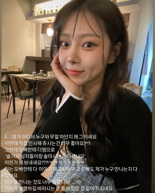 이어 "저한테 직접 인사해 주시는 건 너무 좋아요! 그런데 오빠(유현철)한테 DM(다이렉트 메시지)으로 '슬기씨 남자들이랑 술 마시는 거 아시나요' 이런 거 왜 보내세요?"라며 분노했다.