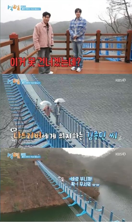 21일 방송된 KBS 2TV '1박 2일 시즌4'에서는 김종민이 하늘다리의 공포에 비명을 지르는 모습이 전파를 탔다.