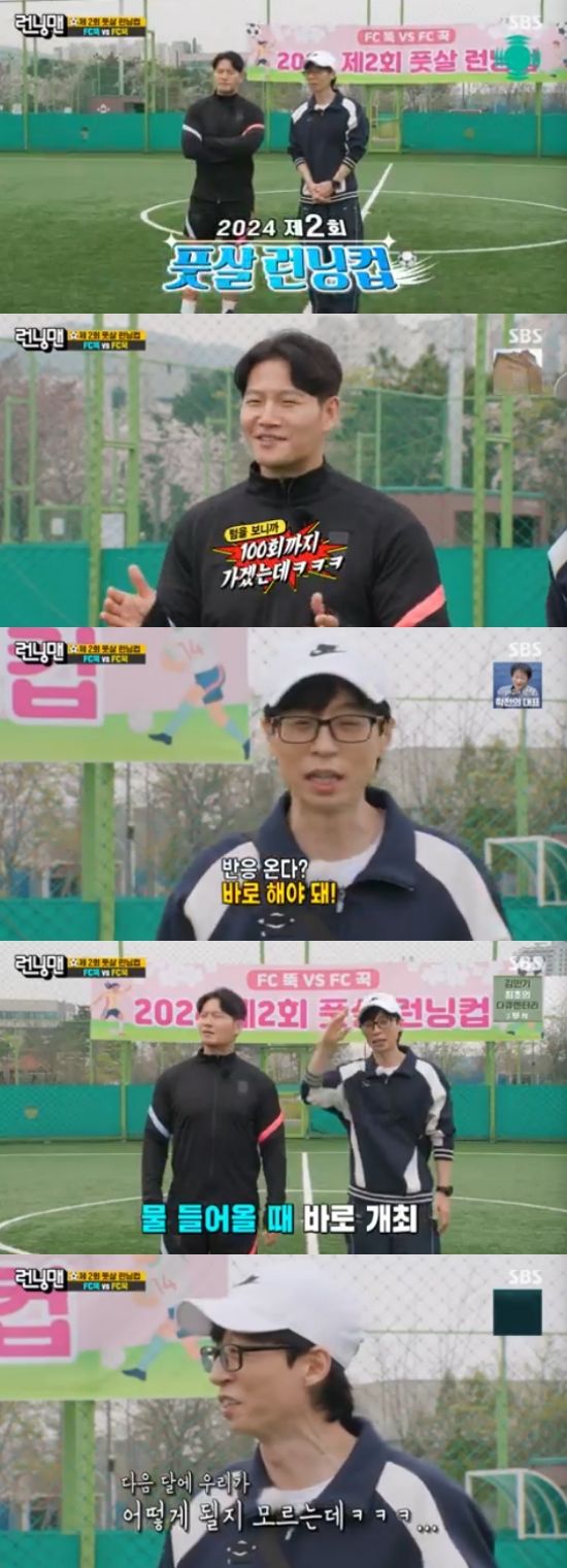 이날 제작진은 유재석과 김종국에게 '제 2회 풋살 런닝컵' 개최 소식을 전했고, 유재석은 "빨리 왔다. 즘 같은 시대에 '반응이 온다' 싶으면 빨리 해야한다. 묵혀두면 안 된다. 다음 달에 우리가 어떻게 될지도 모르는데"라고 시작과 동시에 돌직구를 던져 웃음을 줬다.
