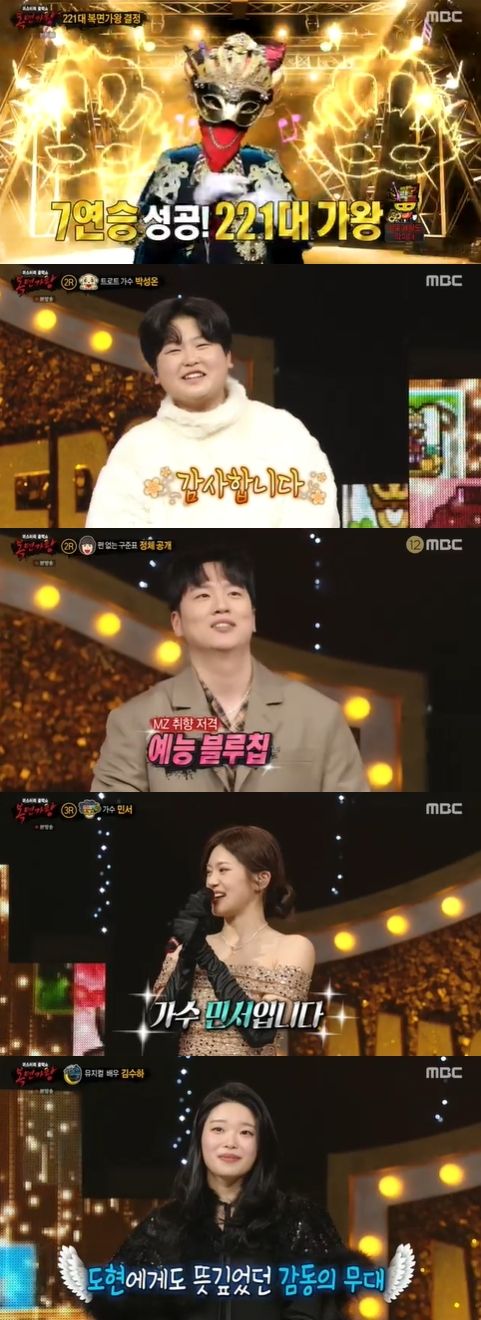 [조이뉴스24 정지원 기자] '복면가왕' 희로애락도 락이다가 7연승에 성공했다. 이어 박성온 한해 민서 김수하가 출연해 인상적인 가창력을 뽐냈다.