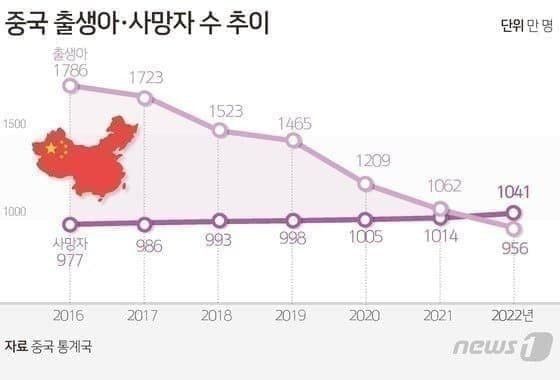 참고로 2016년엔 출생아 1786만, 출산율 1.7로 나름 양호했으나 시진핑 2기때 전세계에서 제일 빠르게 곤두박칠치기 시작해 올해 0명대 ㄷㄷ