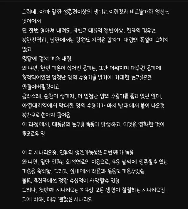 2. 2번 시나리오 : 영화 ‘투모로우’의 현실화로 북반구 절반 이상이 얼어붙는다 (수만년간의 빙하기가 다시 시작)