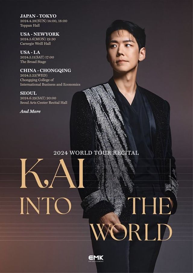최근 서울 강남구 도곡동 EMK 엔터테인먼트 사옥에서 카이를 만났다. 올해 데뷔 16주년을 맞은 그는 오는 28일 일본 도쿄 톳판홀을 시작으로 다음 달 미국 뉴욕 카네기홀, LA 더 브로드 스테이지, 중국 충칭대외경무대학 음악홀, 오는 6월 대한민국 서울 예술의 전당에서 첫 월드투어 콘서트를 개최한다.