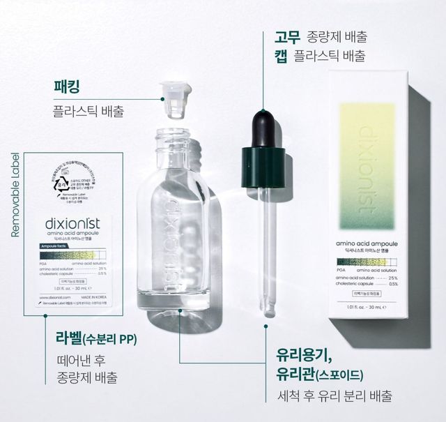 딕셔니스트 ‘아미노산 앰플’을 모두 비웠다면 브랜드가 안내하는 분리배출법을 따라볼 것. 불필요한 탄소배출을 한번 더 막을 수 있다. 제품의 제작 과정부터 마지막 순간까지 탄소베출을 절감하고자한 딕셔니스트의 진심을 엿볼 수 있다.