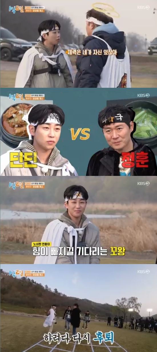 혼자 남은 딘딘은 김종민과 나인우를 피해 연정훈에게 접근하며 "덤벼라 이 늙은이"라고 도발을 했다.