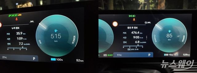 아이오닉5의 완충 후 최대주행거리(왼쪽)와 476.4km 주행 후 남은 배터리 잔량. 사진=박경보 기자