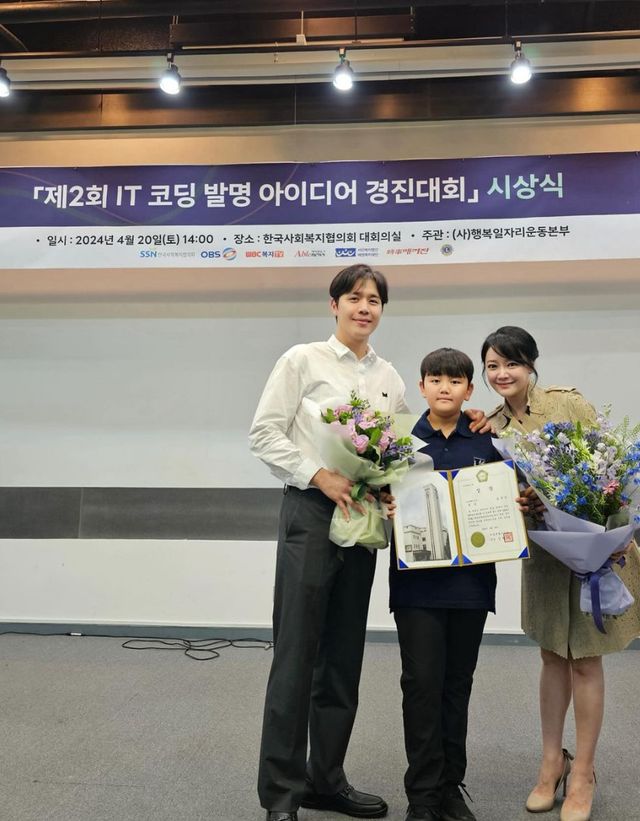 공개된 사진에는 김소현, 손준호 부부의 아들 주안 군이 코딩 경진대회에 입상한 모습이 담겼다. 소프트웨어 우수 부문에서 동상을 수상했고, 이들 가족은 꽃다발과 상장을 든 채 행복한 미소를 짓고 있다.
