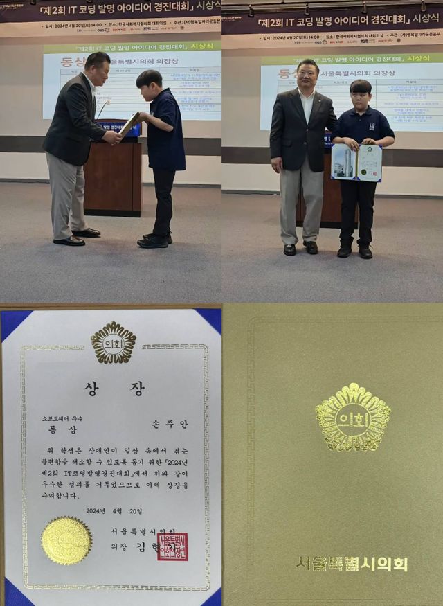 상장에는 "위 학생은 장애인이 일상 속에서 겪는 불편함을 해소할 수 있도록 돕기 위한 '2024년 제 2회 IT 코딩 발명 경진대회'에서 이와같이 우수한 성과를 거두었으므로 이에 상장을 수여한다"는 글이 적혀있다.