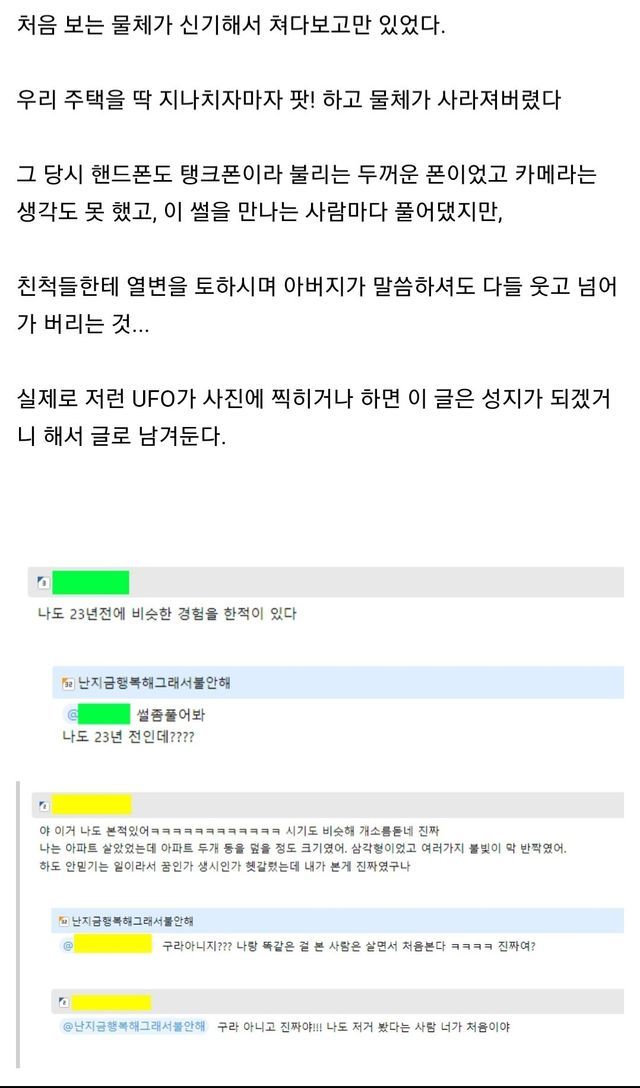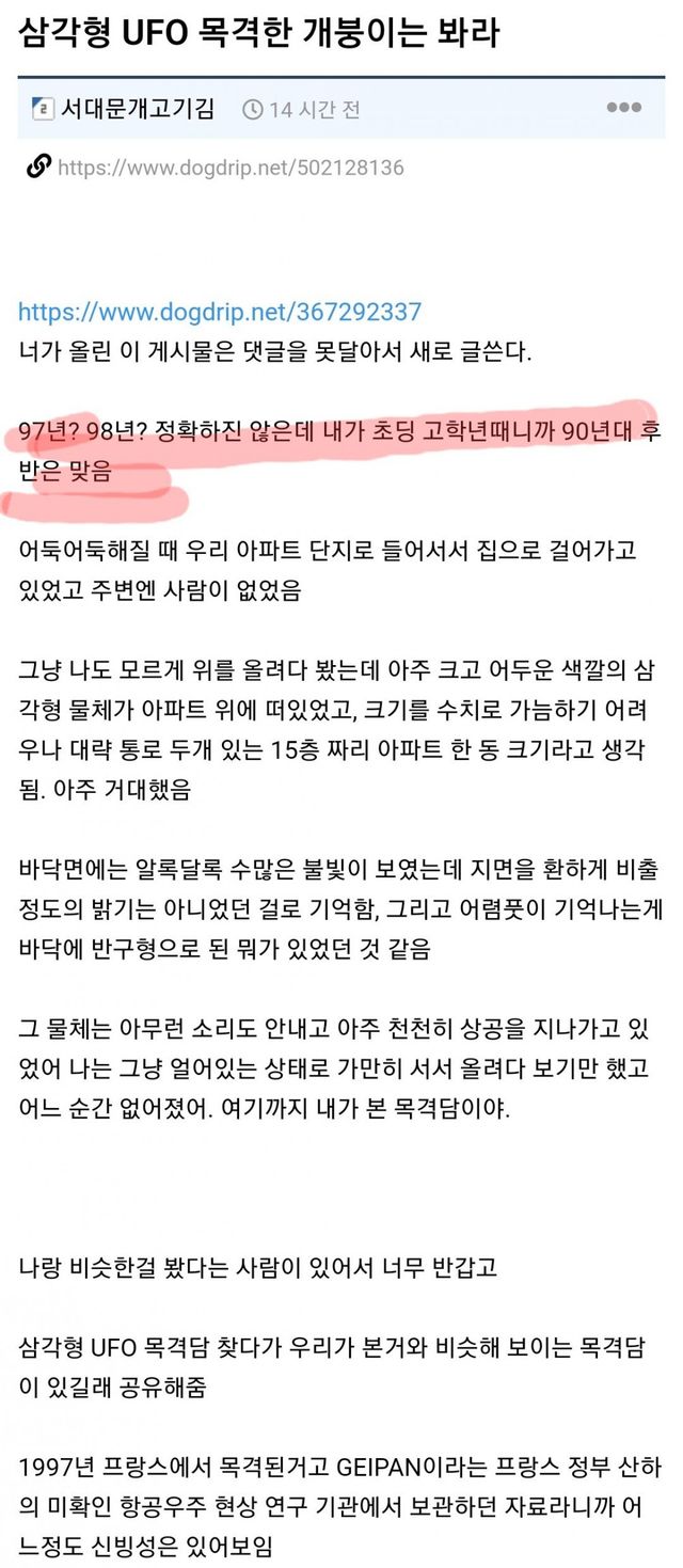 상공에서 아파트 한동 크기의 밑판이 형형색색인 초거대 삼각형 UFO를 봤다고 글이 올라옴