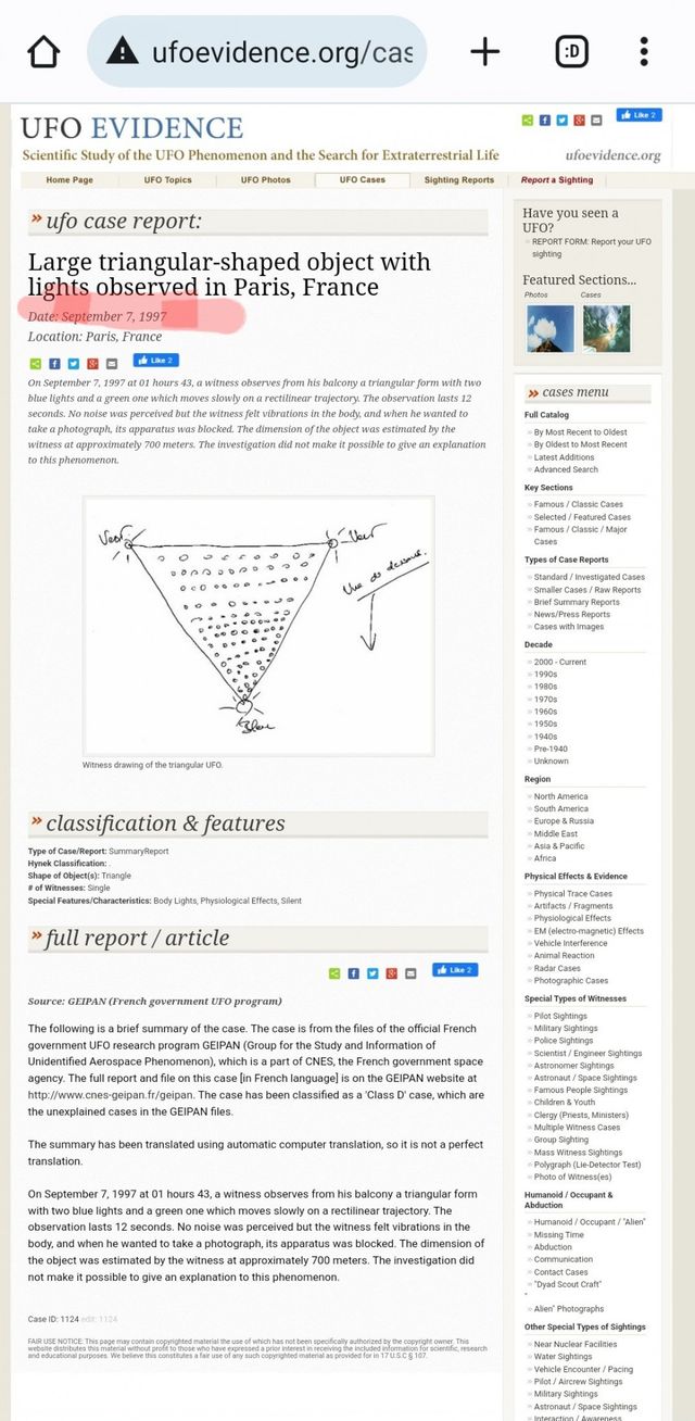 97년 프랑스에서도 밑판이 형형색색인 삼각형, 700미터는 될법한 초거대 UFO를 봤다든 목격담이 있음