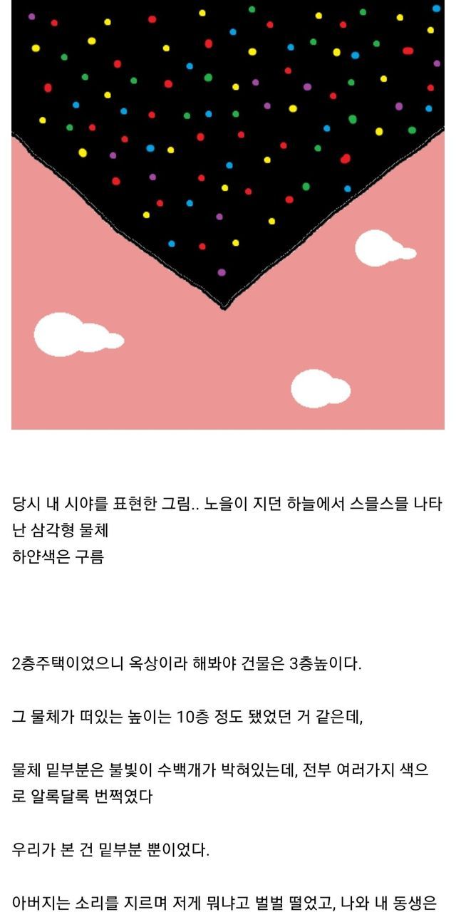 형형색색의 밑판을 가진, 아파트 1동 크기 급의 초거대 삼각형 UFO를 봤다는 개드립 유저의 글 (2021년. 12월)