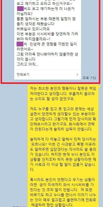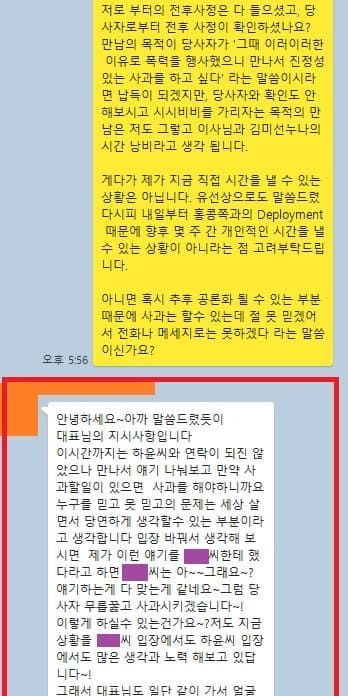 이어 “소속사에 ‘당사자에게 직접 진정성 있는 사과와 폭행의 이유를 들으면 입 닫겠다’고 전달했지만, 소속사는 ‘당사자와 연락이 안 된다. 일단 만나자’는 얘기만 반복했다. 당사자는 회사 뒤에 숨어 사과는 없었다”고 설명하며 메신저 내용을 갈무리해 게재했습니다.