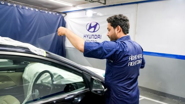 현대차가 개발한 나노 쿨링 필름이 차량에 시공되고 있다. 사진=현대차 제공