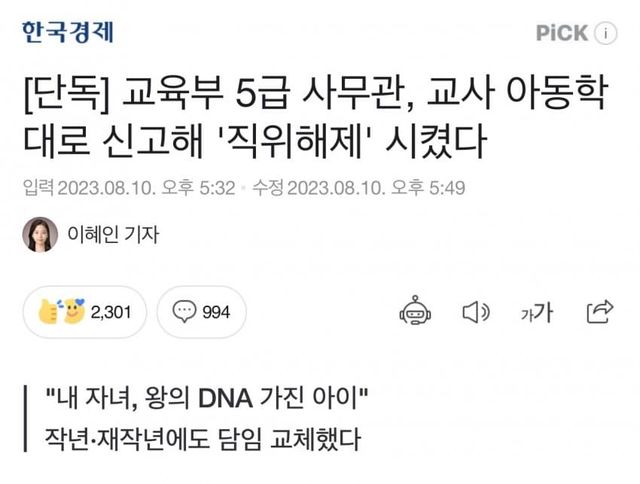 교육부가 자녀 담임교사에게 갑질과 악성 민원을 지속했다는 의혹이 제기된 교육부 5급 사무관을 직위 해제하고 조사에 착수했다. 해당 직원은 담임교사를 아동학대로 신고해 직위해제 처분을 받도록 했으며, ‘왕의 DNA가 있는 아이여서 왕자에게 말하듯 말하라’ 등의 비정상적인 요구를 했던 것으로 전해졌다.