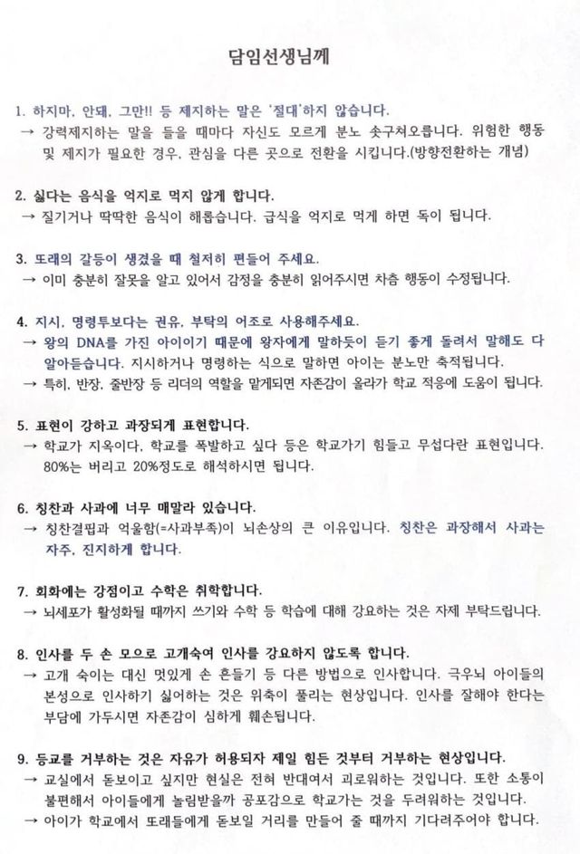 B씨가 공개한 A씨의 편지에는 ‘하지 마, 안돼, 그만! 등 제지하는 말은 절대 하지 말라’ ‘또래의 갈등이 생겼을 때 철저히 편들어 달라’ ‘왕의 DNA를 가진 아이이기 때문에 왕자에게 말하듯이 듣기 좋게 돌려서 말해도 다 알아듣는다’ 등의 내용이 담겼다. 초교조에 따르면 B씨는 지난해 11월 A씨로부터 아동학대로 고소를 당한 이후 소송을 이어오다 올해 5월 무혐의 판결을 받았다.