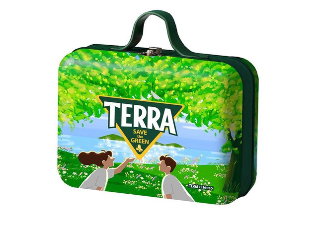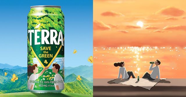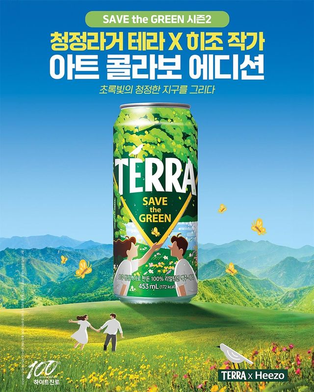테라와 히조가 함께한 ‘SAVE the GREEN 시즌 2’ 에디션 제품을 들여다보면 테라의 트라이앵글 로고와 푸른 자연 속 나무, 호수 배경이 한데 어우러져있다. 그리고 한 가운데에는 평화로운 시간을 즐기는 듯한 두 남녀의 실루엣이 자리잡고 있다.