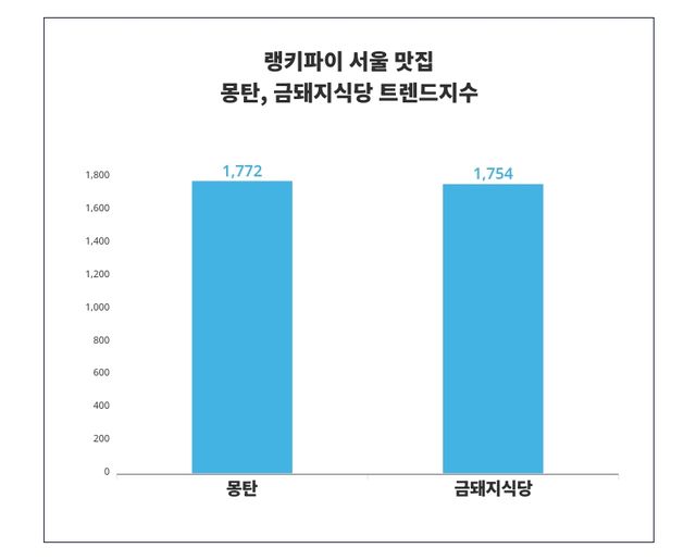 서울 맛집 트렌드 지수 부문에서 몽탄이 '1,772포인트'로 선두를 달리고 있으며, 금돼지식당이 '1,754포인트'로 그 뒤를 이어가는 것으로 나타났다는 분석 결과가 발표되었다. 해당 표에 따르면, 몽탄은 금돼지식당을 '18포인트' 차이로 앞서며서울 맛집 트렌드에서 두드러진 관심을 받고 있는 것으로 드러났다.