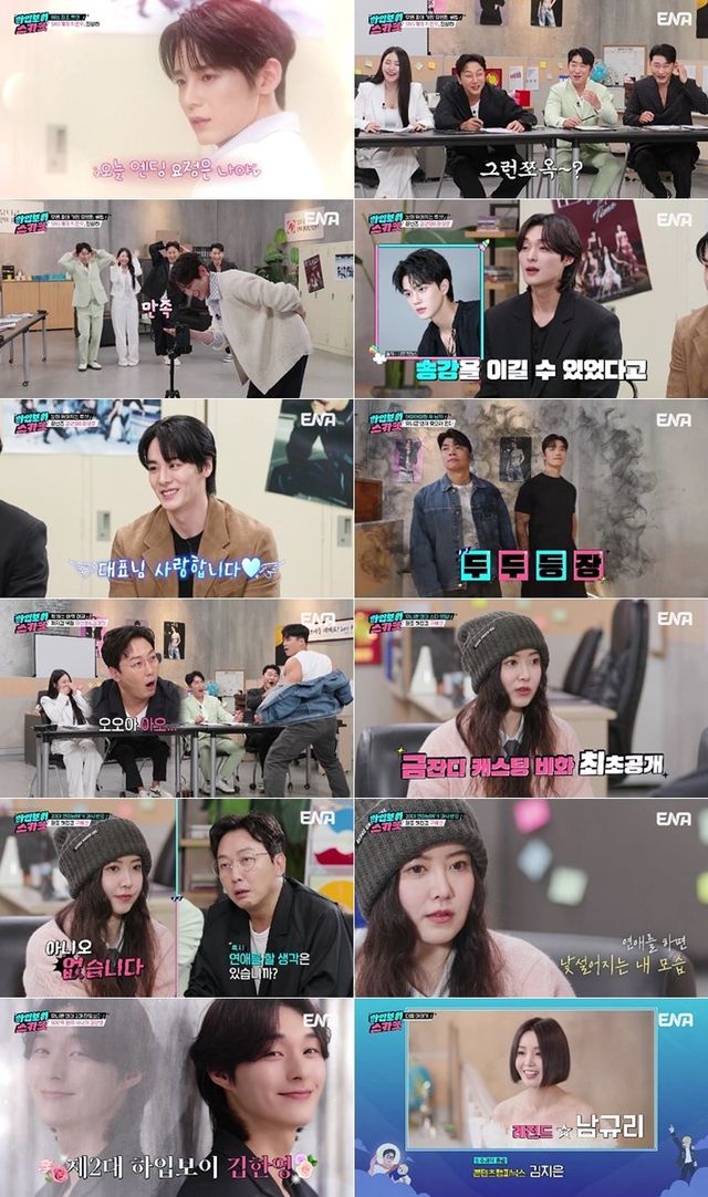 전창하가 한바탕 ‘폭풍’을 일으키고 떠난 가운데, 신규진은 “저스틴 비버, 브루클린 베컴, 남주혁과 함께 보그지 전세계 핫보이 50인에 선정된 하입보이”라며 장성훈을 소환했다. 연이어 ‘박서준 판박이男’ 김한영까지 등장하자, 유정은 양 볼을 붉히며 사심을 드러냈다. 김한영은 소속사 최종 오디션에서 송강과 자주 맞붙었던 사연을 털어놓는가 하면, ‘박서준 닮은꼴’ 평가에 대해서는 “듣긴 들었지만 저는 김한영이다”라고 당찬 매력을 내뿜었다. 장성훈 역시, 욕설이 난무한 ‘맑눈광’ 캐릭터를 연기해 현장을 초토화시켰다.