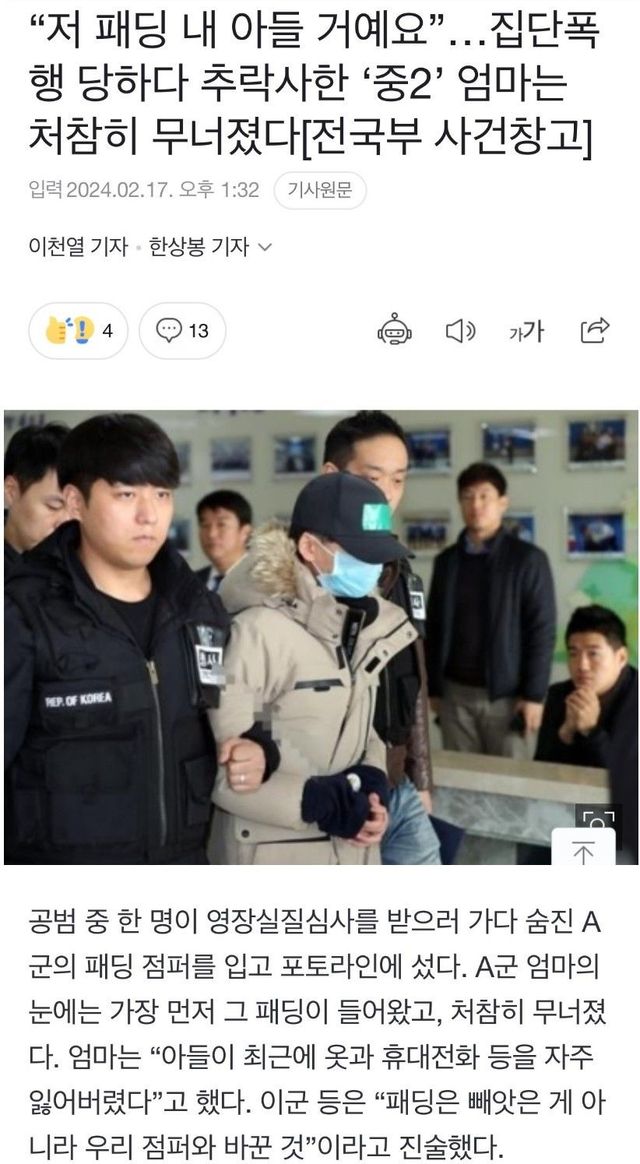 영장 심사 받으러 포토라인 섰는데, 그 때 입고 온 패딩도 갈취한 패딩