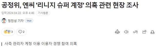 3월 18일 게임이용자협회에서 공정위에 엔씨소프트가 슈퍼 계정 투입해서 현질 부추겼다고 공정위에 고발했는데