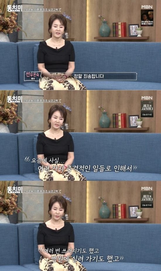 이에 선우은숙은 지난 13일 MBN '속풀이쇼 동치미' 방송 말미에 홀로 등장해 자신의 이혼에 관한 이야기들을 전했다. 당시 선우은숙은 "나 역시 어렵고 힘든 시간을 보내고 있다. 요즘에 사실 여러 가지 충격적인 일들을 통해서 여러 번 쓰러지기도 했고 실려가기도 했고 회복이 아직 안 된 상태"라고 고백했다.