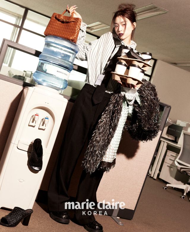 핀스트라이프 니트 리넨 셔츠와 타이, 트라우저, 레더 인트레치아토 프린지 코트, 헤드독 레이스업 슈즈, 꼬냑 인디아모 핸드백, 정수기에 앞에 놓인 인트레치오 위빙으로 완성한 아토믹 뮬 모두 가격 미정