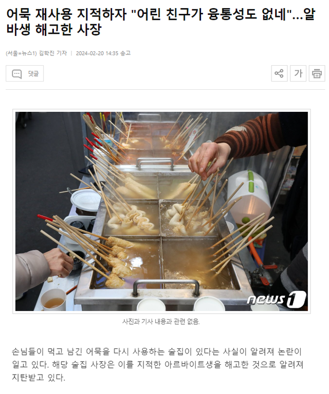 A 씨는 "그 술집은 어묵을 손님에게 제공하고 손님이 먹은 양만큼만 계산한 후 남은 어묵을 재사용하는 곳이었다"며 "조카가 (가게 사장이) 손님들 침도 튀고 흘린 술도 묻은 상온에 2~3시간 올려져 있던 어묵들을 다시 가져가서 그 바구니 그대로 없는 양만큼만 채워서 다른 손님에게 내놓는다"고 밝혔다.